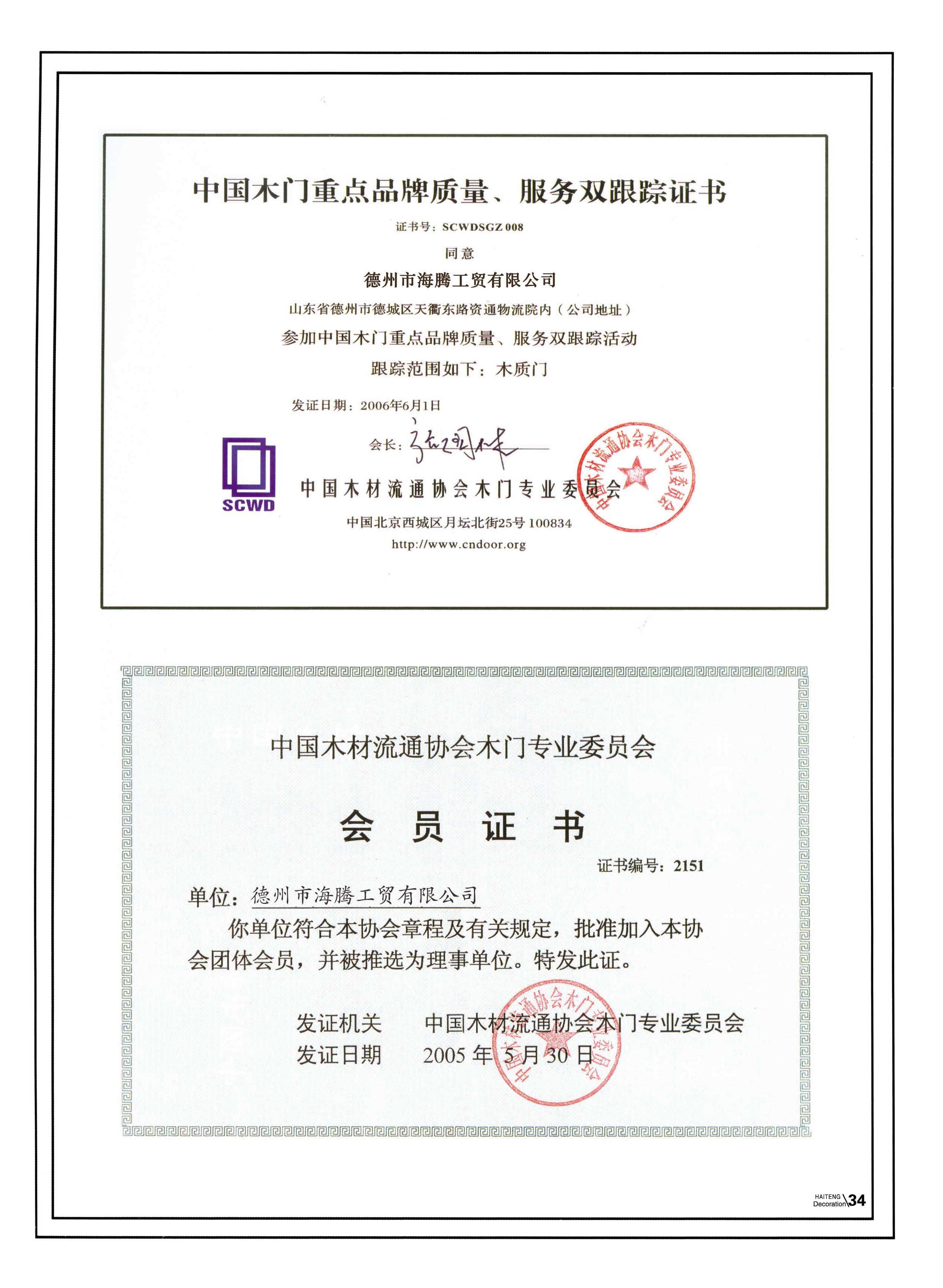 中國(guó)木材與木制品流通協(xié)會(huì)木門(mén)專業(yè)委員會(huì)副會(huì)長(zhǎng)單位,堅(jiān)持走"專精特新"發(fā)展之路。